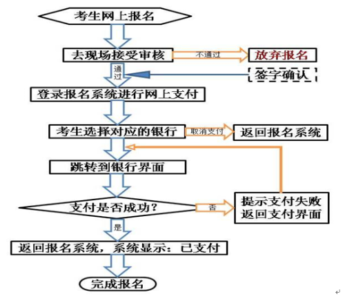 第五步,缴费。现场审核通过后,网上缴费确认截至日期前,考生可再次登录NTCE网上报名系统,查看审核结果并按照系统提示进行在线支付考试费(附面试网报在线支付流程图及在线支付银行列表)。缴费后考生可在网上报名系统中查询报名是否成功。未经审核或审核不通过的考生,不能网上支付考试费。逾期未在网上缴纳考试费的考生,报名系统将视其为放弃报考,并自动注销该生当次报考信息。